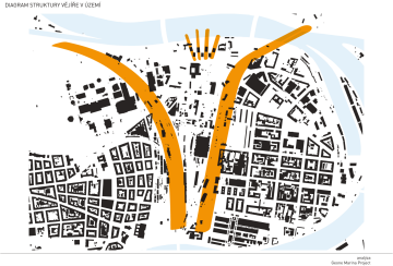 “Na počátku projektu v roce 2016 jsme zakládali pomyslnou urbanictickou osu SEVER-JIH. Výrazné linie železničních tahů, které se rozevírají na severozápad a severovýchod, nás přivedly k úvaze, že na opačném konci, tedy na jihu u Vltavy, by měl být vybudován urbanisticky výrazný prvek, který bude tvořit jakousi vstupní bránu do navazující vertikály bubenského území, “popisuje Jiří Havrda.